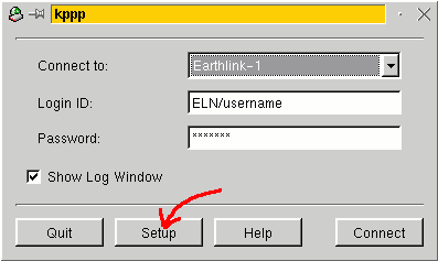 This is the first screen that comes up when you invoke kppp. Of course if you have no accounts set up the account name space will be blank. When you click on Setup, the next screen shows. |
