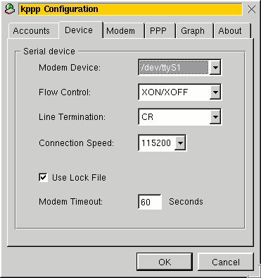 ![]() | The Modem Device should be set to /dev/ttys0 for COM1, /dev/ttys1 for COM2, etc. XON/XOFF sets the flow control to hardware (always a good idea to have a hardware modem under linux). Most 56K or 33.6 modems are designed to work at a modem to computer speed of 115200. By using an init string incorporating the W2 parameter, you can force the modem to report line connection speed. |